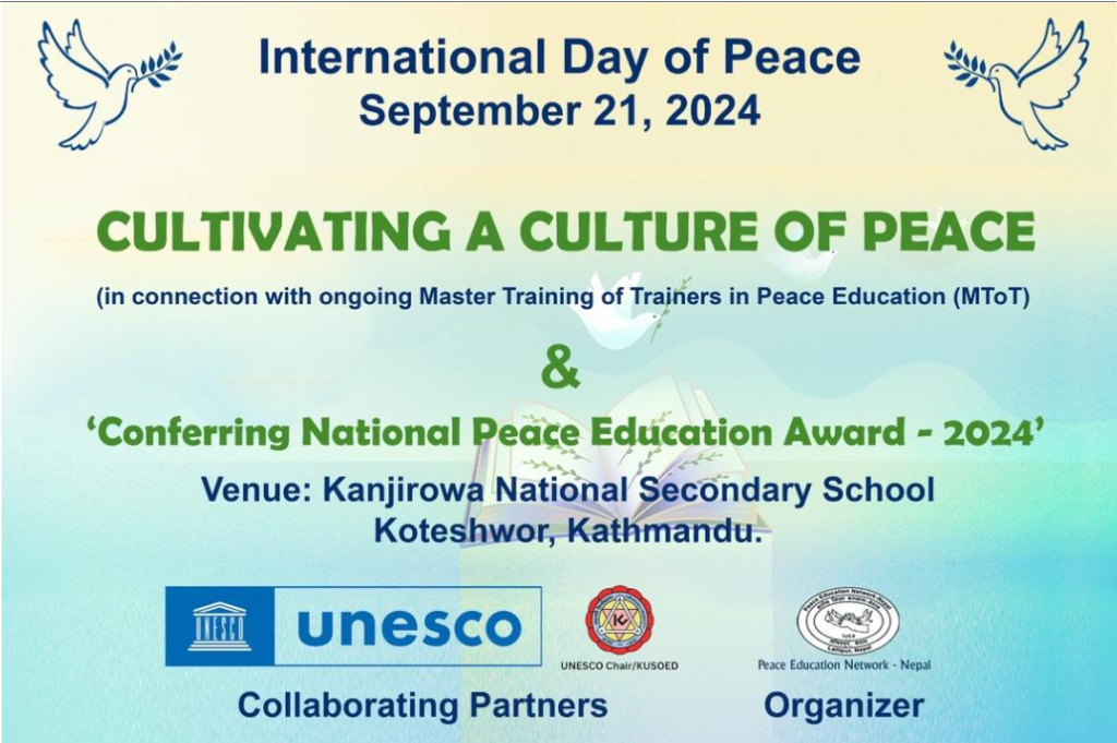 - On September 21, International Day for Peace, we award dedicated and motivated Peace Activist(s) who have worked incessantly for Peace Building in Nepal for more than a decade with National Peace Education Award. This was begun in 2019 and we have awarded 3 such National Personalities (Late Assoc. Prof. Dambar Bir Thapa, Chintamani Nath Yogi, Ph.D. and Mrs. Stella Tamang) and this year – 2024, we have awarded the 4th recipient (Ret’d. Lt. Gen. Bala Nanda Sharma). At the same time, every year on September 21, we update our national baseline data on the roster of Peace Activists.
